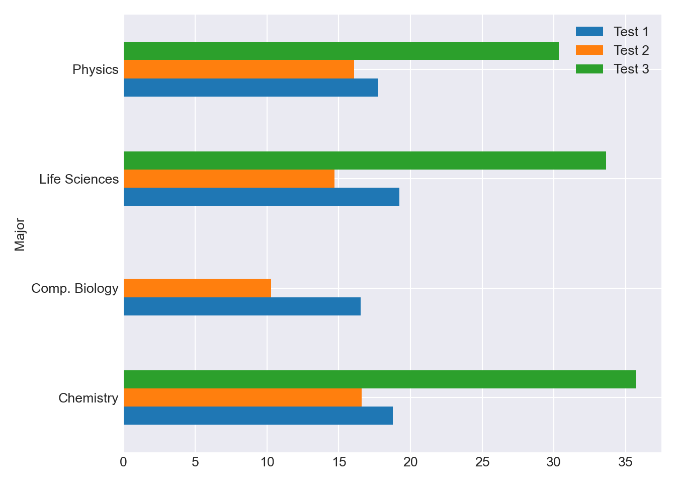 grp = df_combined.groupby(['Major'])[["Test 1", "Test 2", "Test 3"]] grp.mean().plot(kind='barh') plt.tight_layout() plt.show()