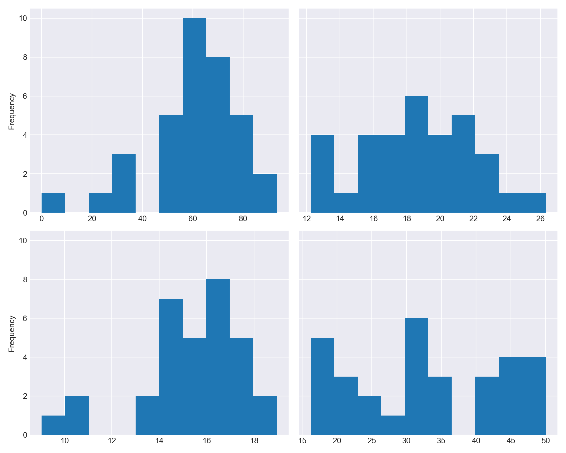 axoption. Let me show you.fix, ax = plt.subplots(nrows=2, ncols=2, sharey=True, figsize=(10,8)) df_combined['Total'].plot.hist(ax=ax[0, 0]) df_combined['Test 1'].plot.hist(ax=ax[0, 1]) df_combined['Test 2'].plot.hist(ax=ax[1, 0]) df_combined['Test 3'].plot.hist(ax=ax[1, 1]) plt.tight_layout() plt.show()