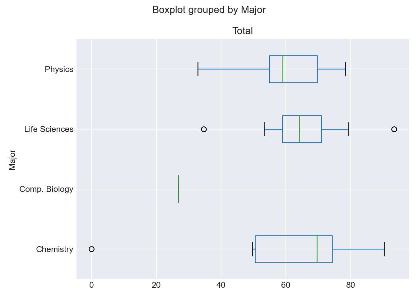 df_combined.boxplot(by='Major', column=['Total'], vert=False); plt.tight_layout() plt.show()