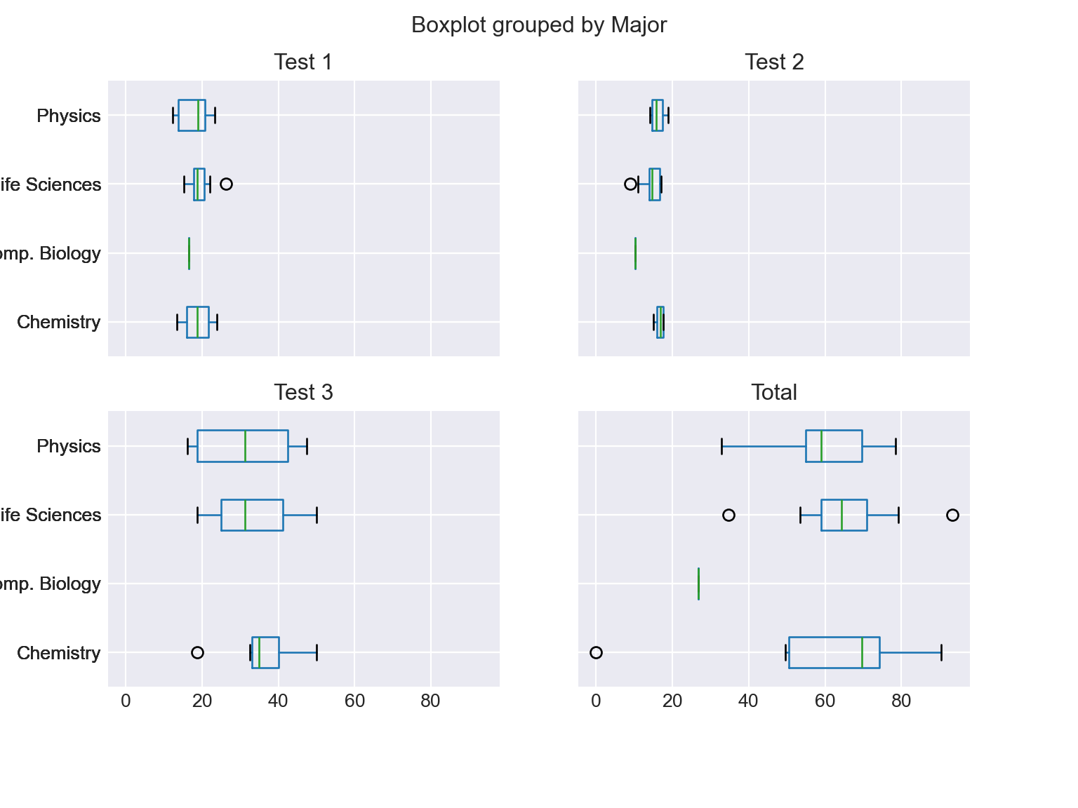 df_combined.boxplot(by='Major', column=['Test 1', 'Test 2', 'Test 3', 'Total'], vert=False, figsize=(8, 6)); plt.show()