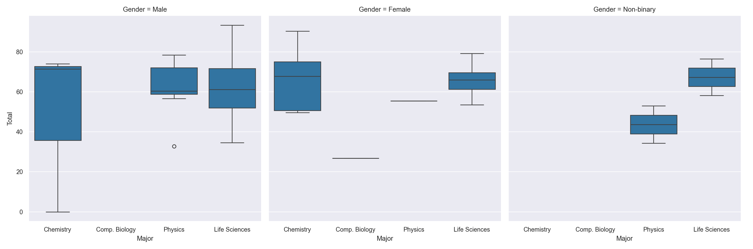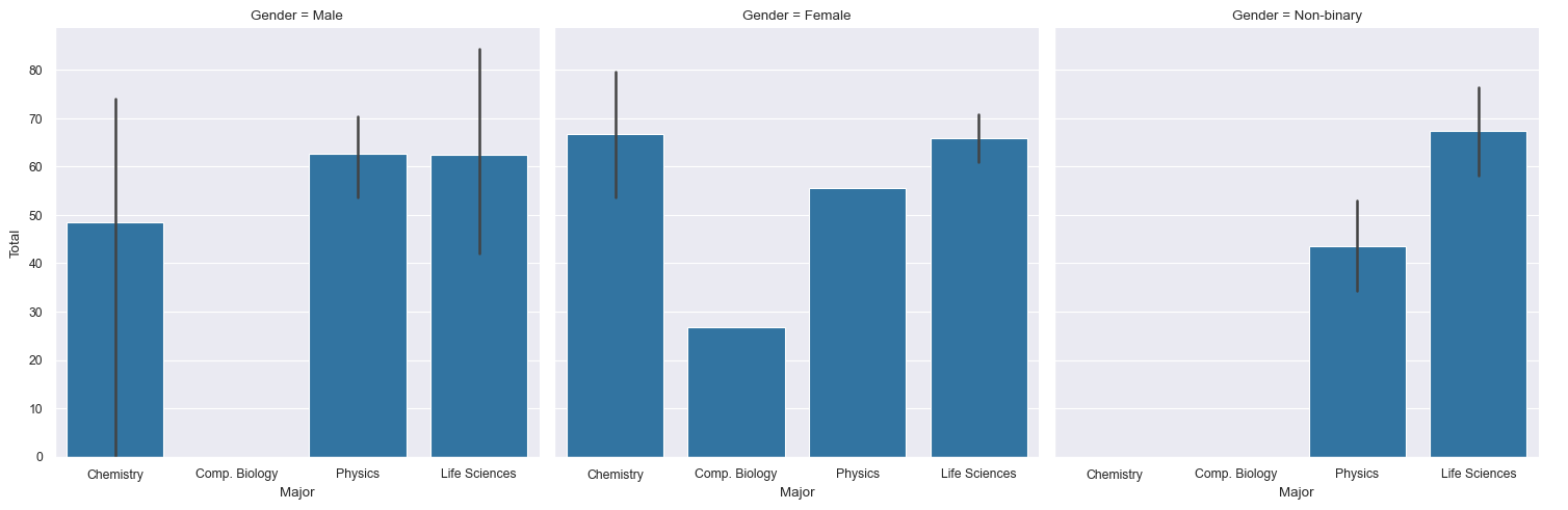 catplot()is used forcategorical data. Show me a bar chart for (the numbers in) columnTotalbased on the categorical variables in columnMajor. Split the plots into columns according to the categories inGender.sns.catplot(data=df, x="Major", y="Total", col="Gender", kind="bar")