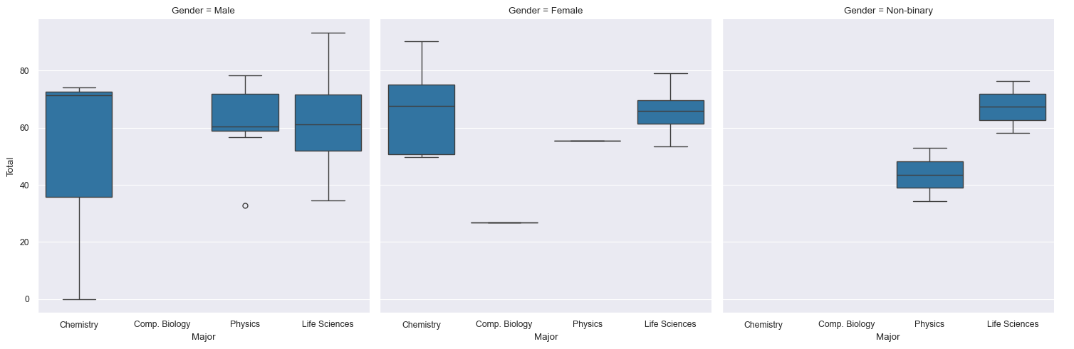 sns.catplot(data=df, x="Major", y="Total", col="Gender", kind="box")