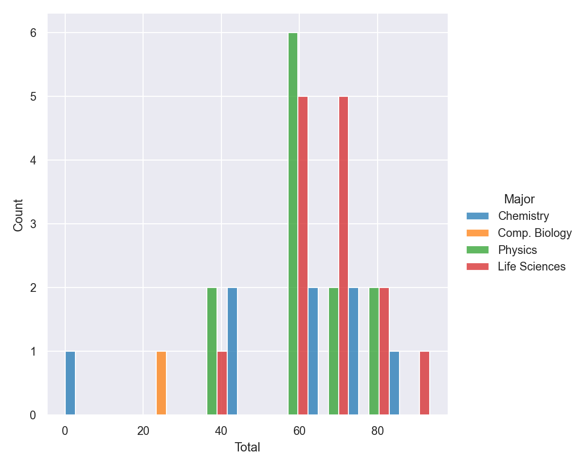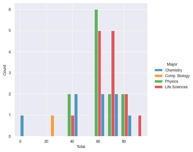 displot()for plotting distributions. Show me the histogram for the scores inTotalseparated out based on theMajor. Dodge the bars so that they do not overlap.sns.displot(data=df, x='Total', hue='Major', multiple="dodge")