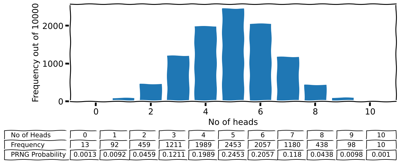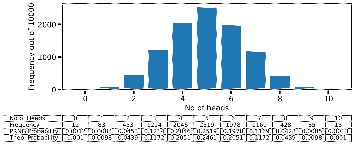 rowLabels=['No of Heads', 'Frequency', 'PRNG Probability'],