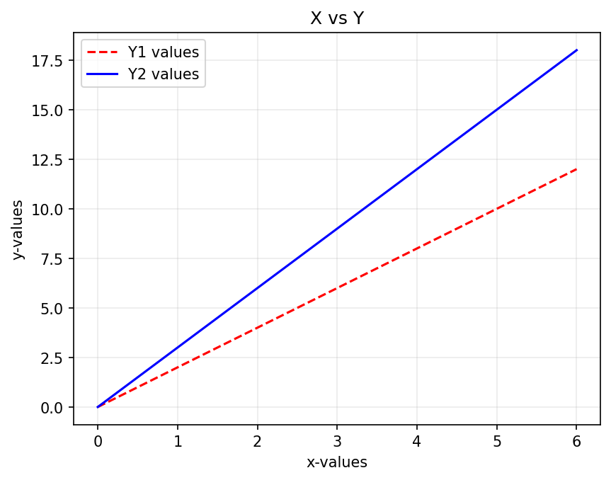 plt.plot(x, y, color='red', linestyle='dashed', linewidth=2)plt.plot(x, y_1, label='Y values',