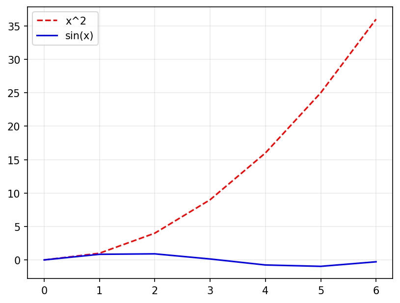 One of the advantages of NumPy arrays is that they allow us to generate data-related mathematical functions easily. Let’s reuse our previous code to plot \(x^2\) and \(\sin(x)\)