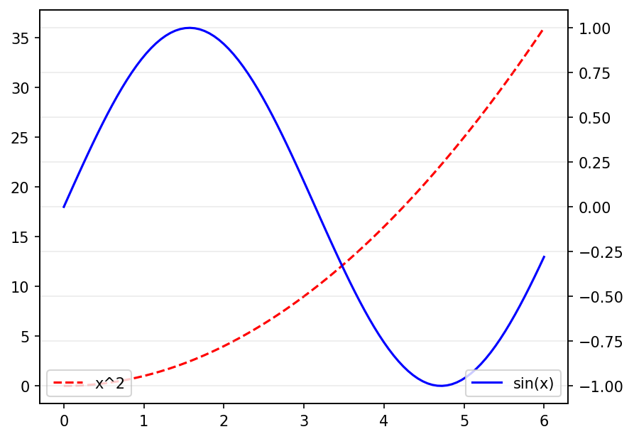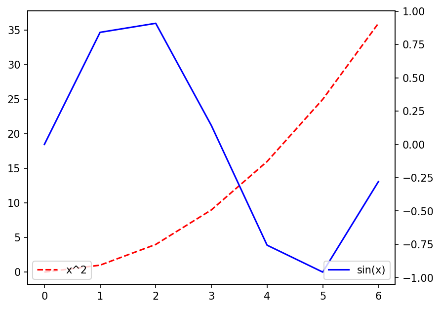 Alas, our plot does not look good because \(\sin(x)\) lies between \(\pm 1\), but \(x^2\) has no such bounds. One way to fix this is to add another y-axis that shares the same x-axis.