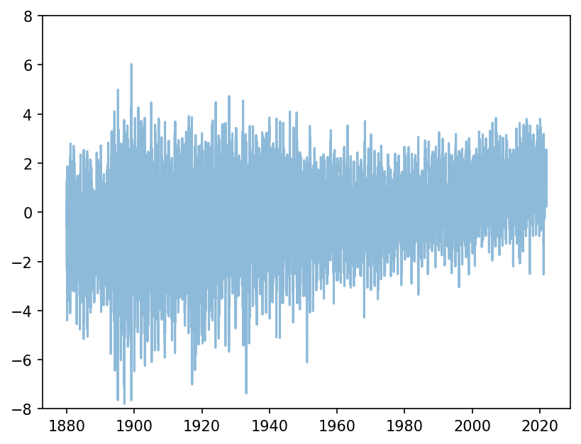 plt.ylim([-8, 8])I have used a small alpha value to soften the colour of the plot and made the plot range symmetrical in the \(y\) direction.