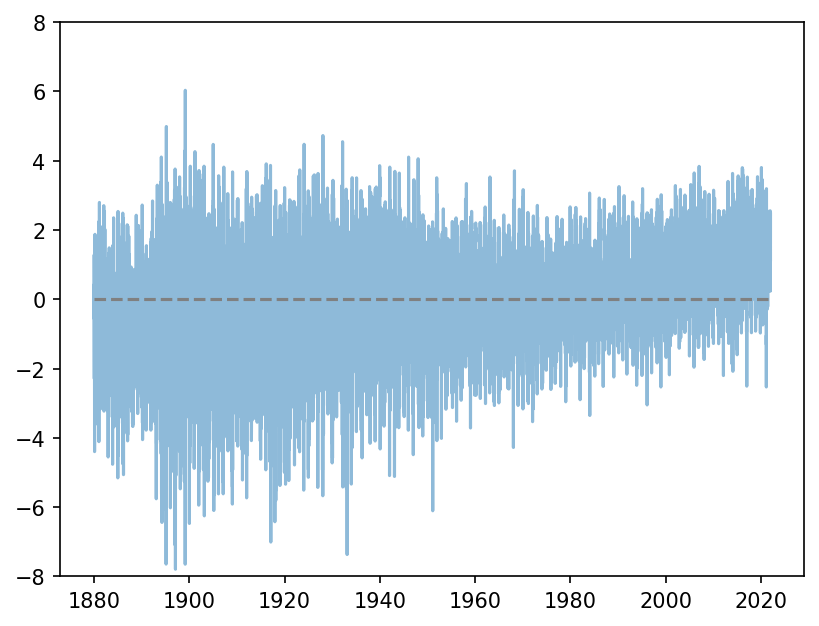 plt.hlines(0, date[0], date[-1], linestyle='--', colors='grey')