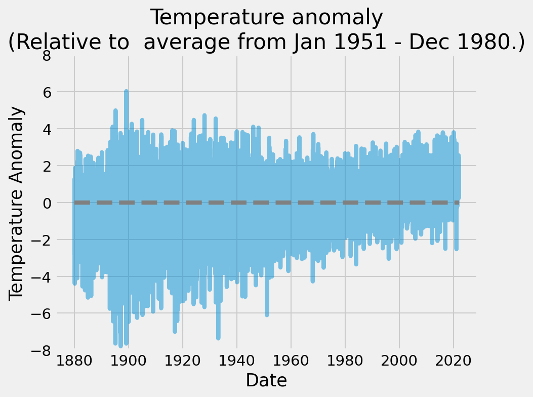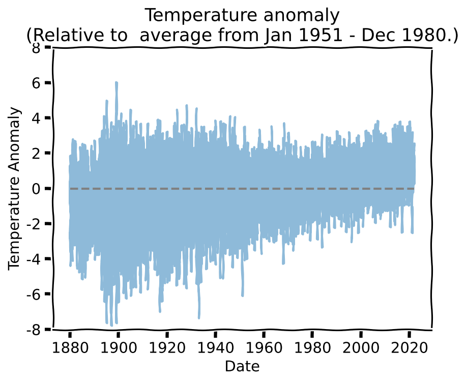 plt.title('Temperature anomaly\n(Relative to average from Jan 1951 - Dec 1980.)')xkcd!